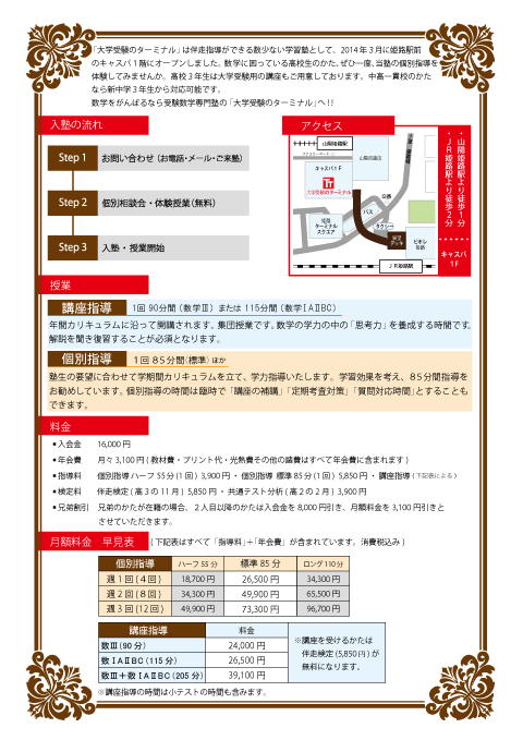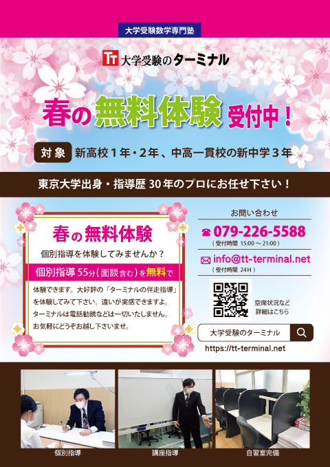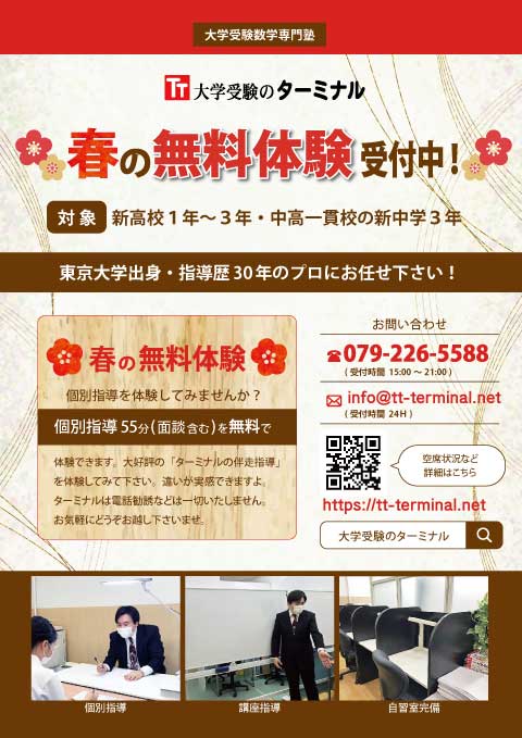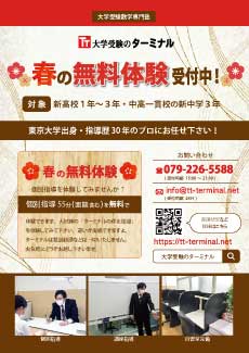 大学受験のターミナルは、 質の高い学力指導を提供できる「大学受験数学の専門塾」として、2014年の春、姫路に開校いたしました。当塾が自信を持っておすすめする指導法「伴走方式(ばんそうほうしき)」をぜひ体験してみてください。あなたの数学の苦手を分析し、得意科目に変える道すじを開きます。