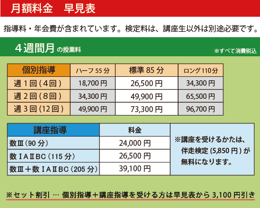 数学について、今の状態や今後の勉強法、受験の話などをさせていただきます。無料体験授業を受けて頂き、納得してからの入塾となります。個別相談・体験授業を合わせて55分間です。