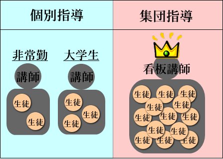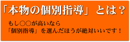 もし『指導者の質が』高いなら 「個別指導」を選んだほうが絶対いいです! その理由は、 皆さまは「個別指導」という指導形態について、どのようにお考えでしょうか。 社会には本当に多くの学習塾があり、いろんな形態の、さまざまなレベルの学習指導を提供しています。大学受験勉強の指導となると、「個別指導」はコストが高い割に質が悪い、との印象をお持ちではないでしょうか。 現実は全くその通りです。 世の中には残念な「個別指導」が溢れていると言わざるをえません。 原因は優秀な指導者の圧倒的な人材不足です。 学力・指導力を兼ね備えた優秀な指導者は、そもそも絶対数が少なく、その多くは全国資本の傘下に集まっているといってよいでしょう。そして良い人材は収益性の高い「大規模集団指導」すなわち個別でない一斉授業形式の講師として投入されるのが普通です。従って地方都市の教場に優秀な指導者が配属されるのはまれだし、ましてや「個別指導」で指導にあたるケースは殆どないのです。 【一般の学習塾の例】 では 姫路のような地方都市では、 質の高い「個別指導」を受けることは 不可能なのでしょうか。 神戸や大阪まで出向いて一斉授業形式の講座を受けるしかないのでしょうか。 いや、実はひとつ方法があります。 地元の学習塾すべてが質の高い「個別指導」を提供できないわけではありません。 唯一の例外は、大手資本でなく 独立系の学習塾です。 力のある指導者が自ら開いた学習塾では、 質の高い個別指導の提供が可能です。 「大学受験のターミナル」は、このような独立系の学習塾です。収益性を追求する企業化した塾ではなく、質の高い指導を提供すること自体を目的として開校されています。 「質の高い指導」が提供されるなら、一斉講座形式の集団指導よりも個別指導のほうが学習効果として優れていることは疑いようもありません。 質の高い指導とは、必ずや「伴走方式」となります。「伴走方式」で指導するには、指導者に高い学力と指導力が不可欠です。「大学受験のターミナル」はこの条件を満たしています。 【大学受験のターミナル】の例