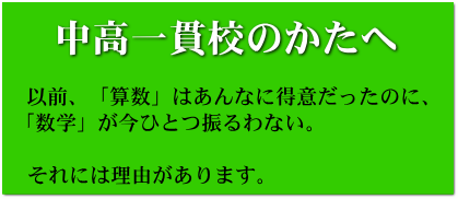 私立の中高一貫校に通学されているみなさま、数学は順調に勉強されていますか。 中高一貫校では独自のカリキュラムに従い、公立では成しえない数学の指導が行われていると思います。国が定めた中学数学は内容が薄く(少なく)、高校数学は内容が濃く(多く)なっています。基本的にはこれを平均的なペースにならして高2の前半までに全ての課程を終わらせる方式となるでしょう。公立と比べて非常に有利なカリキュラムだといえます。 さらにもう一つ、私立進学校に有利な条件があります。本当はこちらの方が大学受験に対する影響は大きいと考えても良いでしょう。 それは生徒全員が、中学受験の算数を経験しているということです。 中学受験の算数は日本伝統の和算の系譜を引き、思考力の育成に大変に優れた効果を持つ科目です。この素養があるかないか、これは大学受験の数学にとって非常に大きな影響があります。算数によって思考力が開発された学生、とくに算数が得意な学生は、大学受験の数学でも、大きなアドバンテージがあるといってもよいでしょう。 ところが算数はあんなに得意だったのに、中学校で数学に失望したり、モチベーションが上がらない、という悩みを抱える方が多くいらっしゃいます。何故なのか。 それは算数と数学が似て非なるものだからです。 算数がケースバイケースの思考力の塊であるのに対して、数学は完全に自然科学です。つまり規則性をつかんで(これが公式)その成果を利用して大量の情報を処理していく科学なのです。いきおい、必要とされる姿勢が算数と数学では異なります。数学はどちらかというと無味乾燥な規則性のやりとり(公式の当てはめ)となってしまい、算数で鍛えられた思考力の出番が少なく、違った能力が要求されるわけです。 例えば、連立方程式を解くにあたって、鶴亀算で暗算した方が意味も良く分かるし早くて正確なのに、機械的な計算式によって解かねばならない、という現象が起こってくるわけです。 ところが、ここが正念場なのです。数学に失望してやる気をなくしている場合ではありません。 大学受験の数学を乗りきるには、高い思考力と大量の情報処理が欠かせません。高い思考力は中学受験で体験した算数の力が大いに役立ちますが、大量の情報処理には何を使うのか。これが中学高校で習う「数学」の力なのです。 算数は高い思考力を発揮しますが、大量の情報処理には時間がかかります。大学受験レベルの問題になると処理しきれません。ここで自然科学としての数学の処理能力が力を発揮するのです。つまり、大学受験の数学の問題を解くに際しては、算数が頭脳となり、数学の技術を手足として利用し問題を解決する、という構図になるのです。 だから中学高校の数学は道具として使えるように磨いておかなければいけませんし、最終的に頭脳となる算数の思考力を鍛えた経験者はきわめて有利なのです。 数学の規則性を理解し使うためにも思考力は必要です。算数の力は必ず役に立ちます。これらの役割分担をよく理解したうえで、中学高校の数学の力もぜひ鍛えて大学受験に備えましょう。